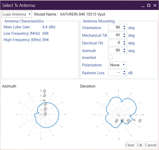 Click on the the button and a dialog window appears where antenna patterns in Generic (Planet) format or NSMA format may be selected. The required antenna pattern files are available from most antenna manufacturers. Please contact support@softwright.com if you have any questions about acquiring and using antenna patterns. When the antenna pattern file is selected and imported, the dialog shows azimuth and elevation thumbnails. Enter the mounting information for the Transmit site and click Ok to use the pattern in a Quick Coverage study.