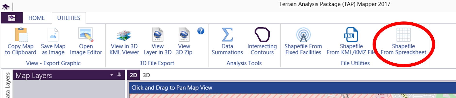 At our recent training seminar in Denver, an attendee had a .csv format spreadsheet file with lat-lon locations and field strength measurements. At his request, Mapper now provides a utility to read a .csv or .xlsx file and create a point type shapefile containing all of the spreadsheet data. Once the shapefile has been created and added as a map layer, it may be styled for visualization, exported in 3D, and used for analysis just like any other shapefile. The Spreadsheet to Shapefile conversion utility is available on the UTILITIES tab of the main ribbon bar as shown below.