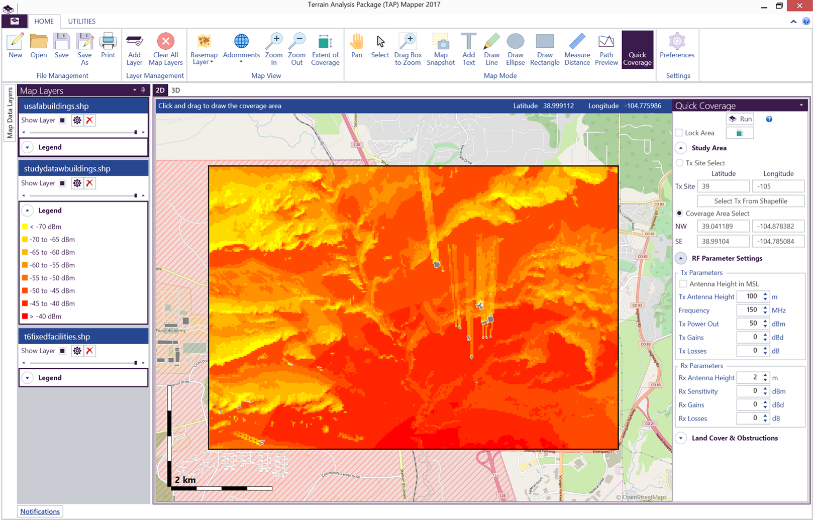 The figure above shows Quick Coverage result where the transmitter is located south of the coverage area and the buildings (shown in gray) result in shadowing of the RF signal. The Quick Coverage right hand side panel is used to quickly and easily define the coverage area, set RF parameters, and include land cover or building obstructions as desired.