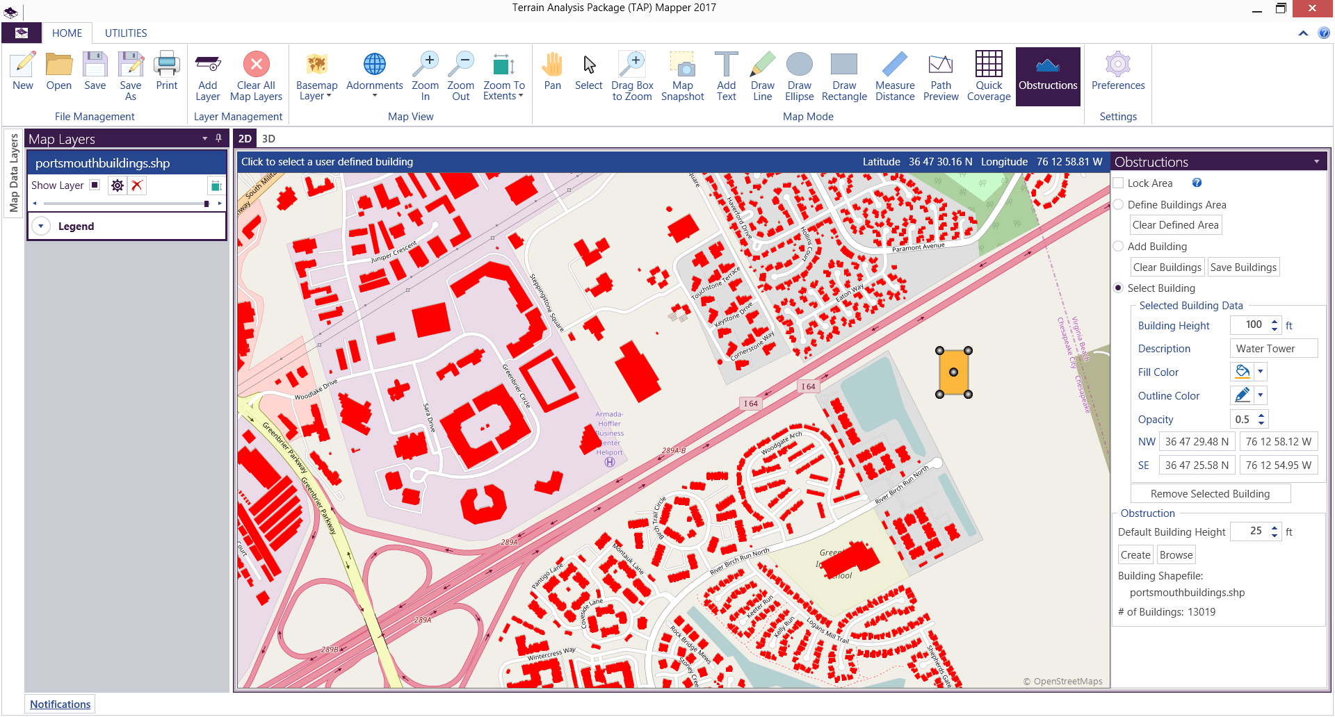 With the release of TAP™ Mapper 2017, users can now import OSM buildings for an area of interest. And, as shown below, use the Obstruction mode to manually enter location and height information for known obstructions not available from OSM. These OSM and manual obstructions may then be saved together in a single obstructions shapefile for use in TAP™ Mapper Path Preview or Quick Coverage. The associated dbf file may also be used as a TAP™ 6 surface feature file in path and coverage studies.