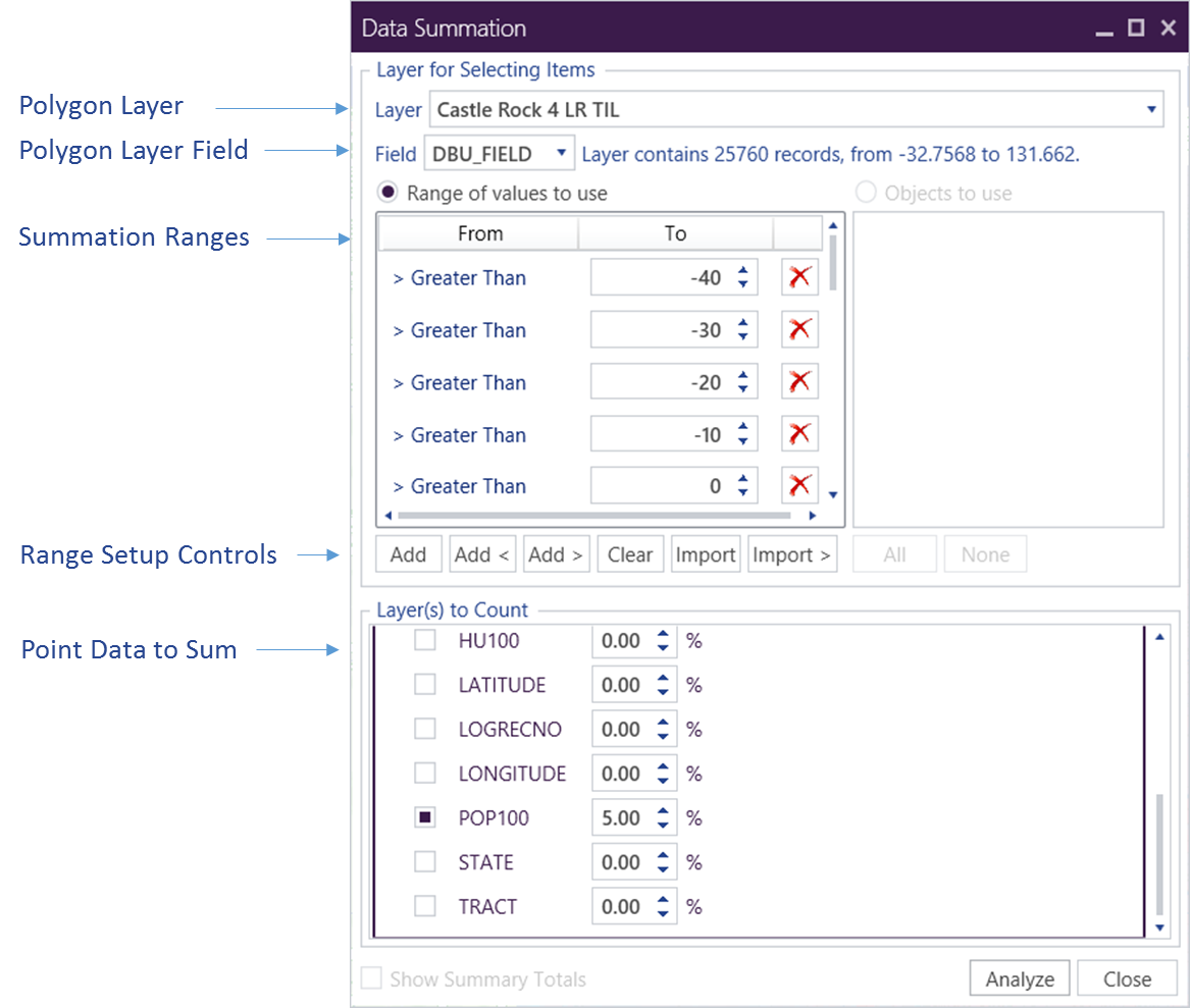 The figure above shows a tile coverage study result as the top Mapper layer with signal strength shading from light blue (lower signal strength) to red (higher signal strength) around the transmitter. The second map layer is block centroid population data for Colorado for the 2000 census. It is shown as a green ellipse marker with white fill. The point data could be any point-type shapefile containing numerical data fields. In order to conduct a Data Summation, at least one point-type shapefile and one polygon-type shapefile must be loaded in Mapper. Now that this criteria has been satisfied, launch the Data Summations dialog by clicking on the summation icon in the Utilities tab of the Main Window. The Data Summation dialog window below will appear.