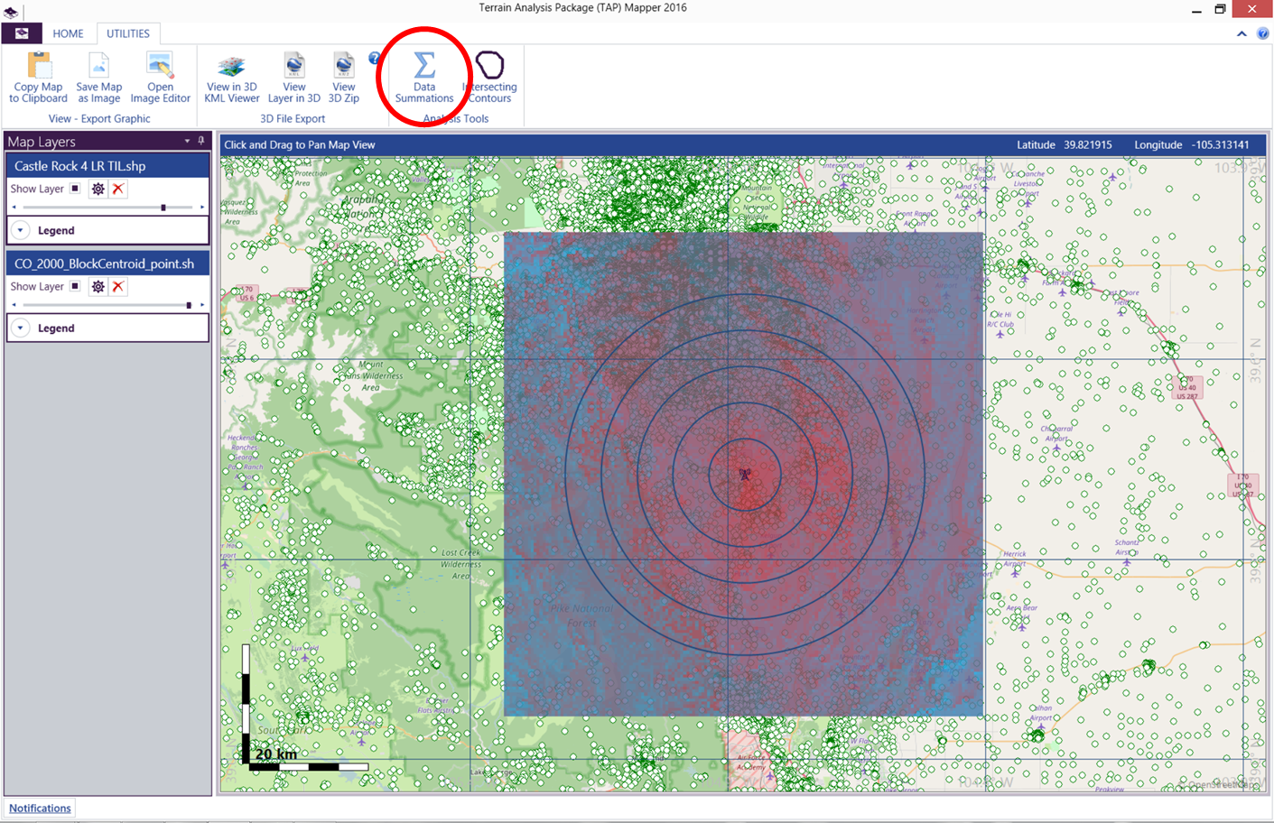 We are pleased to announce today that we have released an update to Terrain Analysis Package (TAP™) Mapper 2016 that includes two new analysis tools: Data Summation and Intersecting Contours. Recall that TAP™ Mapper 2016 installs alongside existing TAP™ software and provides an alternative to the current HDMapper for visualizing, exporting, and analyzing coverage study results. These new Mapper tools expand on the capabilities of similar tools found in HDMapper, offering easier configuration and improved results presentation. The new analysis tools, described below, are available for customers having maintenance subscriptions that expire December 1, 2016 or later. This Mapper update also includes improvements, available to all users, for loading coverage layers and setting layer styles.