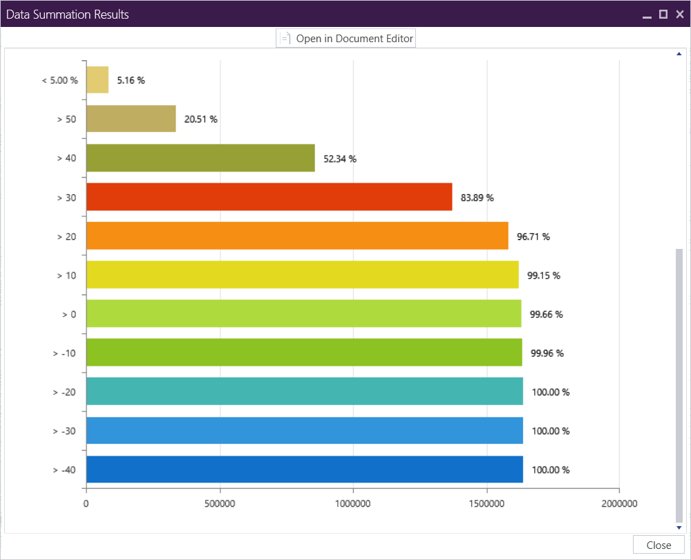 Select the polygon layer that covers the region of interest, define the summation ranges, select the point data to sum, and press the ‘Analyze’ button. A report will be generated that includes tabulated and graphical results showing, in this case, the population covered at each defined signal level range. An example chart of results is shown below.