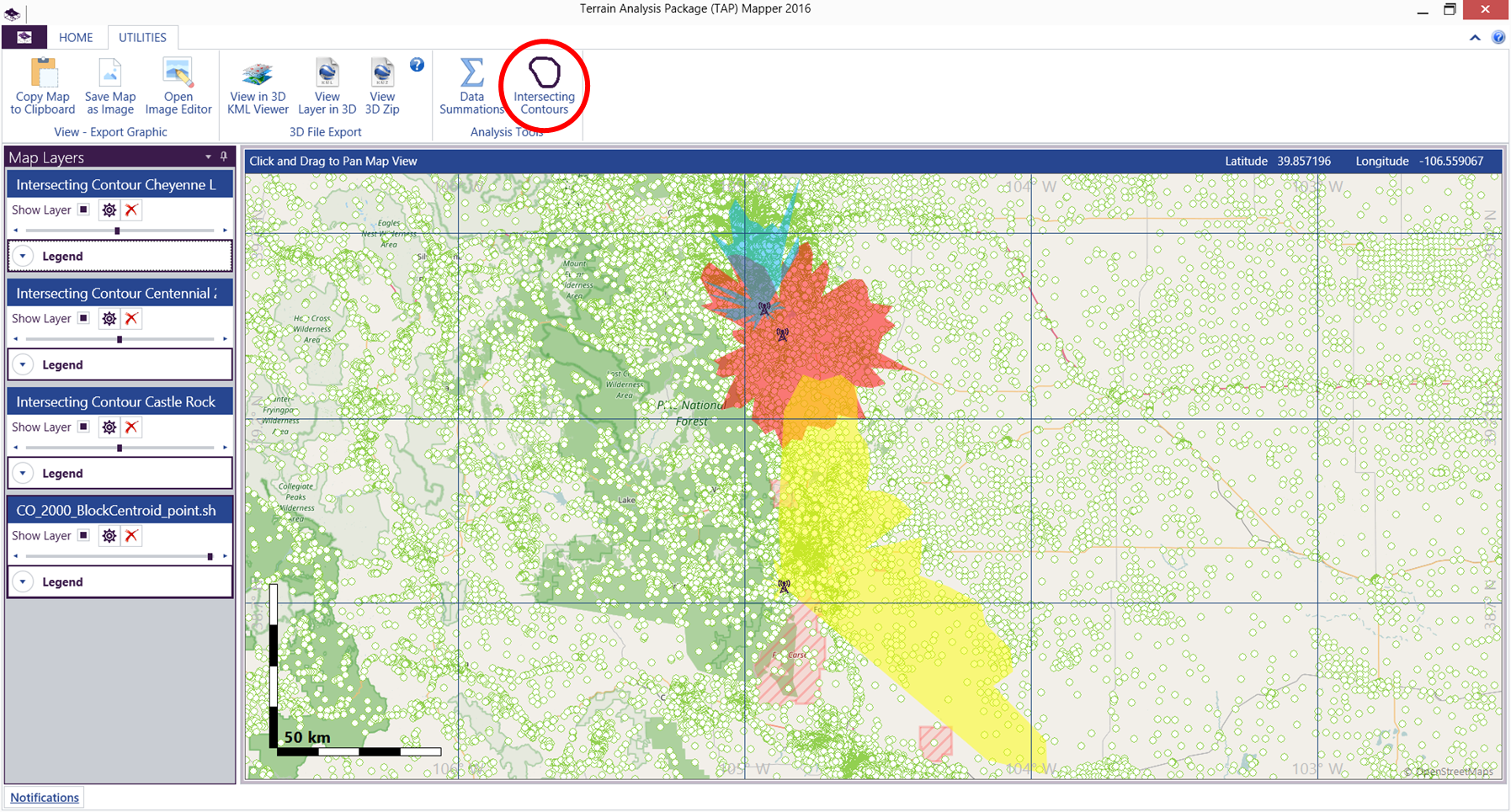 The figure above shows a set of three contour studies created using TAP™ and displayed as blue, red, and yellow polygon regions. The fourth map layer is block centroid population data for Colorado for the 2000 census. It is shown as a green ellipse marker with white fill. The point data could be any point-type shapefile containing numerical data fields. In order to conduct Intersecting Contours analysis, at least one point-type shapefile and one polygon-type shapefile must be loaded in Mapper.
