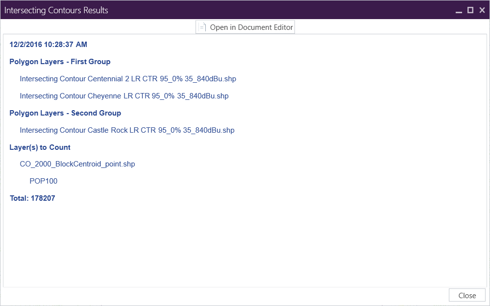 Intersecting Contours provides a tool for the summation of point data from point-type shapefiles over geographical areas covered by a set of intersecting polygon-type shapefiles. The most common Intersecting Contours usage is for conducting population counts wherein the population covered by the intersection of two sets of contour studies is calculated by summing the population residing within the area defined by the contour overlap.