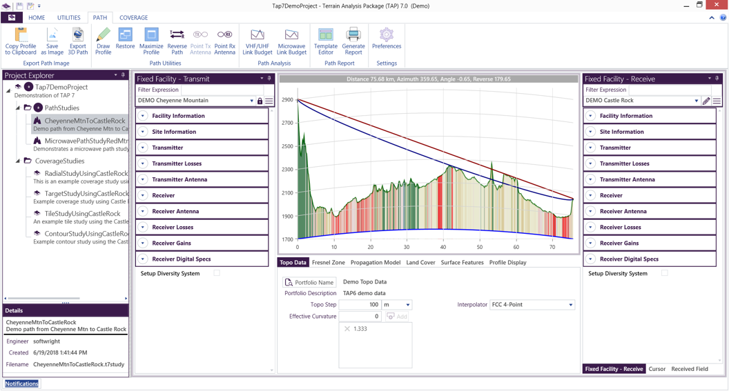 When the files are partitioned and named according to the required naming convention, TAP can determine the land cover classification at a given set of coordinates. As shown below, the land cover category can be shown graphically along a path study. This can aid in the consideration of where trees or buildings may impact link performance and inform the placement of appropriate surface features. It can also help identify where possible reflection points along the path may be especially problematic due to the presence of water.