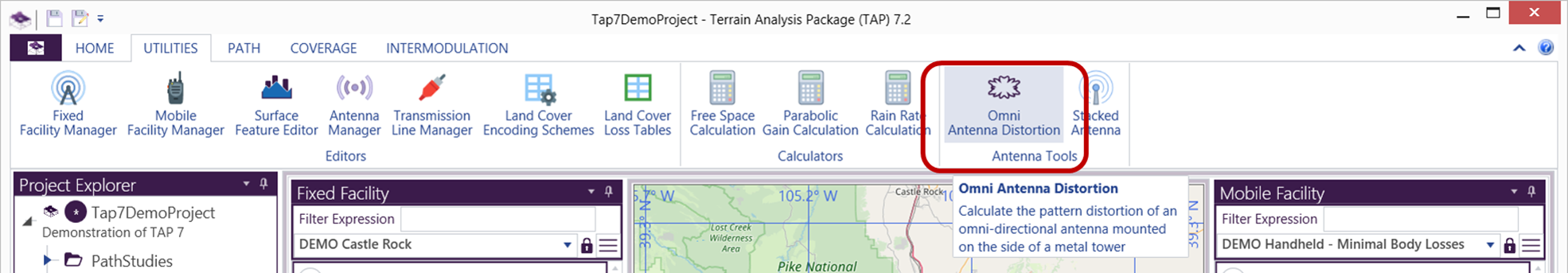 The Omni Pattern Distortion (PD) module allows the user to include the effect of side-mounting an omni-directional antenna on a tower. Launch the Omni Distortion module from the TAP 7 main window UTILITIES tab and then click the Omni Antenna Distortion button.