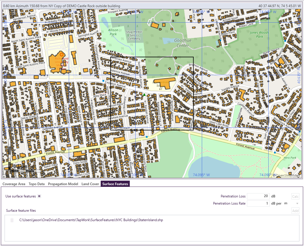 Until now, TAP 6 and TAP 7 surface features were modeled as cylinders with location, radius, height, and type. With today’s release of TAP 7.3.4, any vector file containing polygons can be used as a TAP surface feature obstruction. This is particularly useful in representing buildings. Simply go to the Surface Features tab of the TAP 7 Path or Coverage Study and add the surface feature file. In the example cases, the files contain buildings in Staten Island and Brooklyn, NY, constructed using the Obstructions utility in TAP Mapper. If needed, a Calc button provides an estimate of medium building penetration loss (from TSB 88.2) as a function of frequency and reliability.