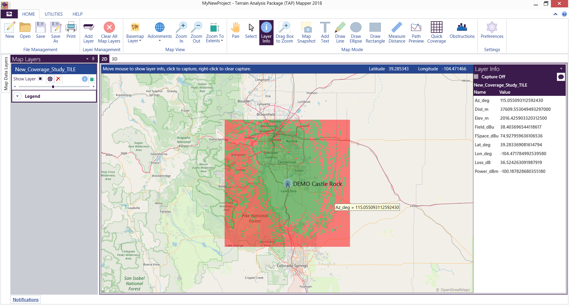 The new Layer Info mode is a quick and easy way to view the data embedded in a shapefile layer at a glance. Simply click Layer Info on the main ribbon bar then use the mouse tip icon to enable mouse tips for your layers of interest. As the mouse is moved over a selected layer with mouse tips enabled, all of the embedded data for the uppermost layer at that mouse location is shown in the right-hand side panel. In the example below, a coverage layer is loaded and all of the saved study information at the mouse location is displayed in the side panel. Left-click the map to “capture” the mouse location and freeze that data in the side panel. Deselect the capture check-box to re-enable live updating of the layer info panel.