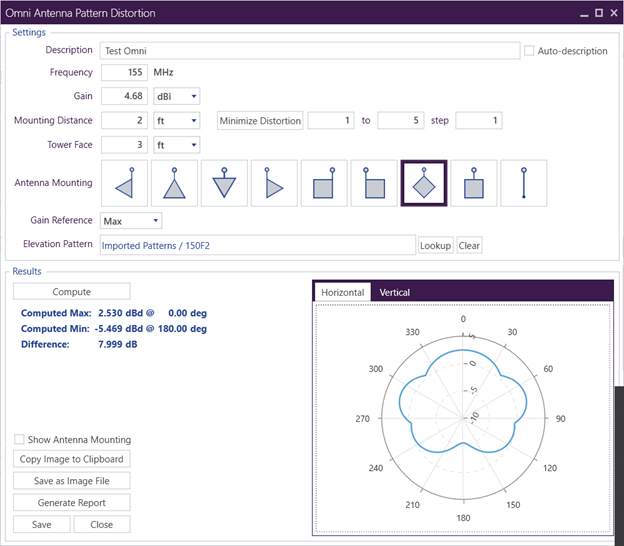 For omni-directional antennas mounted on a structure, the antenna pattern can be distorted by reflections off the tower legs. TAP’s Omni Distortion module predicts the distorted pattern from an empirical model; the distorted pattern can then be used in coverage and path studies in TAP. There are multiple tower configurations from which the user may select.