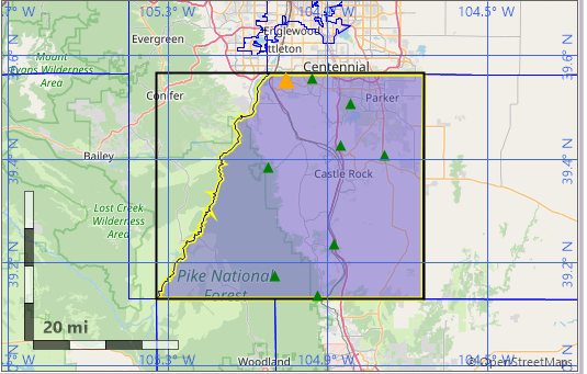 Municipal boundaries are typically available via shapefiles that may be obtain from SoftWright or other sources. The key is to create a Tile Study and the load the shapefile layer and select the active layer on the map to be the shapefile layer containing the county boundaries. Detailed instructions for how to create a Bounded Tile Study are included in the built-in TAP help files. When the bounded tile study setup is complete, the Map View will look something like the below example for Douglas County, Colorado, USA. The coverage study results will only be calculated for points inside the county boundary.