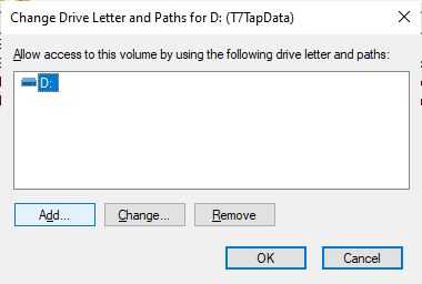 On the Add Drive Letter or Path form, click the “Browse” button. Navigate to the location you want to use as a mount point. The mount point must be an empty folder. When you have selected the empty folder you want to use, click the OK button to close the form. Click the OK button to close the “Add Drive Letter or Path” form: