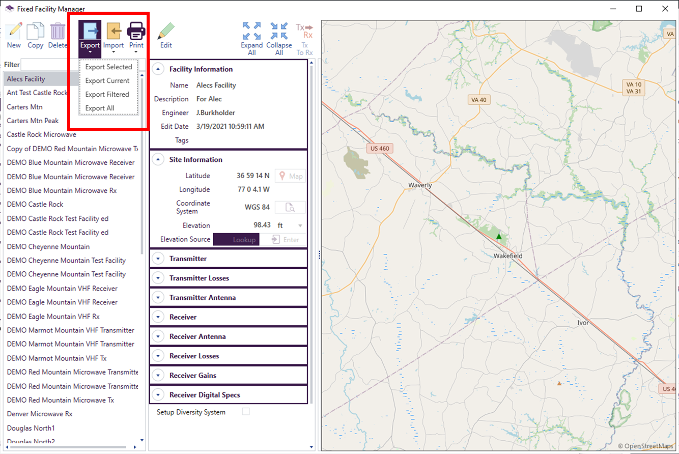 It is not uncommon for TAP users to want to share content and work product between TAP systems or with another TAP user. Fortunately, this is easy using TAP 7. The TAP database management utilities (e.g., Fixed Facility, Mobile Facility, Antenna, and Transmission Line) all contain “Export” functions with various options for sorting and filtering. The utilities also contain “Import” functions. As shown in the Fixed Facility Manager below, Export the desired database elements to a file using the Export dropdown menu. This file may then be taken to the other system and the “Import” function may be used to add those facilities to the Fixed Facility database.