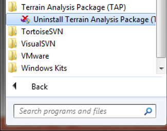 TAP is installed as a standard Windows program with an associated uninstaller. If you are using a version of Windows with a traditional Windows start menu then you can simply browse to the Terrain Analysis Program folder and run the uninstaller as shown below: