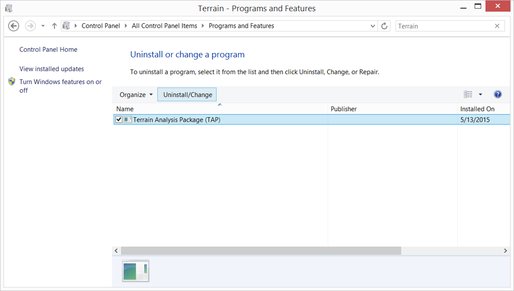 Then search for the Terrain Analysis Package, as shown below, and select Uninstall: