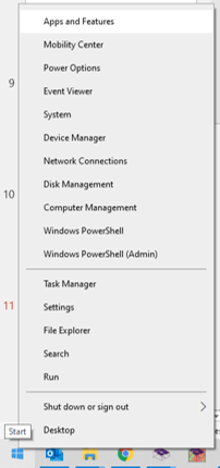 If using Win 8 or later then simply right-click on the Windows Start button in the lower left-hand corner of the desktop and select “Apps and Features” as shown below: