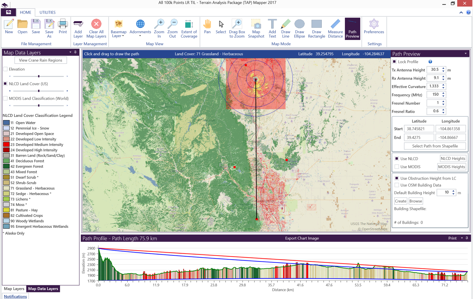 - Global RF Path Preview – The software provides global terrain, land use, and 3D building data that enable worldwide RF path analysis.