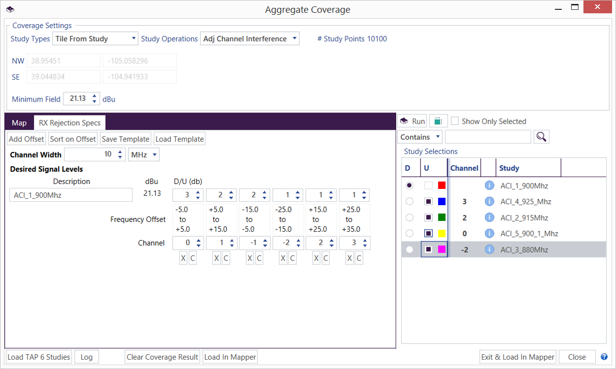 TAP™ Mapper includes the Adjacent Channel Interference (ACI) Module. The ACI Module, although licensed separately, is integrated in the Aggregate Coverage utility as an additional aggregation operation. Component coverage studies of interest may be loaded individually as Mapper layers for use in Aggregate Coverage or, alternatively, all TAP™ studies or projects may be imported with a single button click.