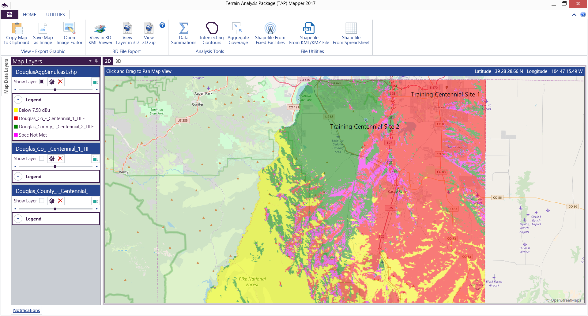 Component coverage studies of interest may be loaded individually as Mapper layers for use in Aggregate Coverage or, alternatively, all TAP™ studies from a project may be loaded by opening the TAP project file. In the image below, two bounded tile studies for two sites in Douglas County, CO, are loaded as Mapper layers.
