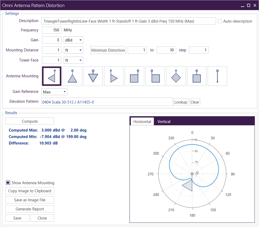 The Pattern Distortion module will model the horizontal plane pattern distortion of a side mounted, vertically-polarized, omni-directional antenna when mounted on a metal tower structure. It uses the mounting orientation and distance from the tower, as well as the size and type of tower, frequency and nominal gain. This modeled pattern can then be plotted and saved to the antenna pattern library and used later to improve accuracy when calculating area coverage. A Tutorial Video is available.