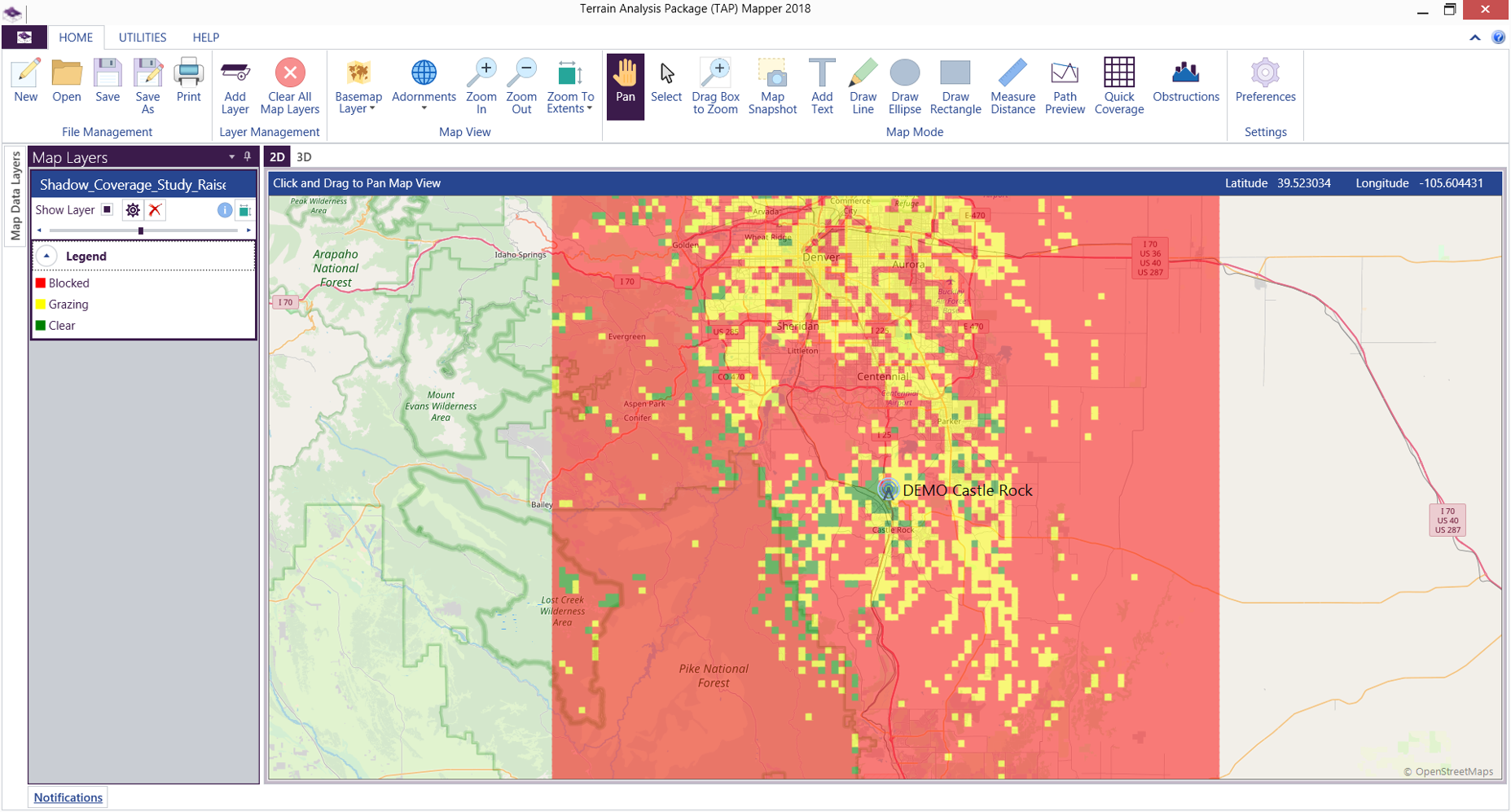 Using this tool will greatly ease the location of unobstructed paths for distant receivers from a particular site for applications such as microwave and SCADA. Results are dependent upon antenna heights, frequency, terrain, obstructions and path geometry. However, the Shadow Mapping module is not a propagation model and received field strength is not calculated.